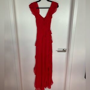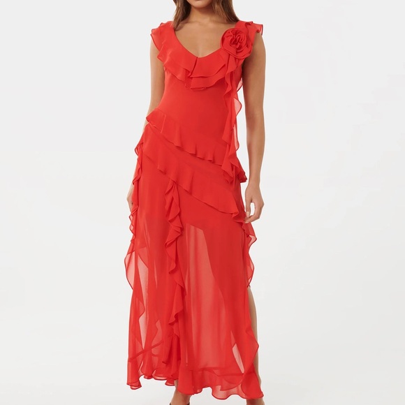 Floor-length skirt with asymmetrical ruffle detail that wraps the body