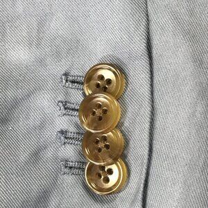 Features: Two-button front; notch lapels; front flap pockets; chest welt pocket; four-button cuffs; lined body and sleeves; interior pocket(s)