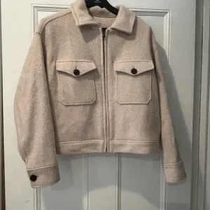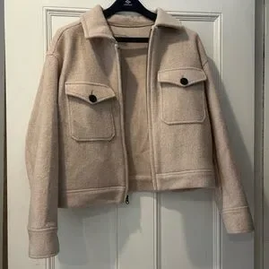 Cropped utility jacket with button-flap chest pockets. Soft cream fabric and front zipper closure. Clean, minimal design with structured collar. Versatile layering piece for casual looks.