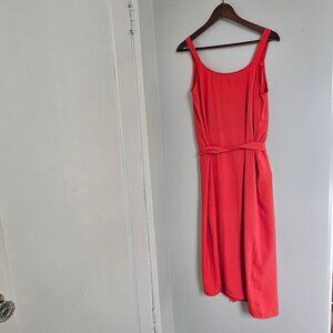 Bright poppy red (orange undertone). Medium-weight fabric with a nice drape, and not at all sheer. Interior ties for extra-secure closure. Long exterior ties allow for tying in front or back. Midi length. Size 4 but I feel would fit up to a 6. Excellent condition, worn only a few times. Comfortable and breezy for spring!
