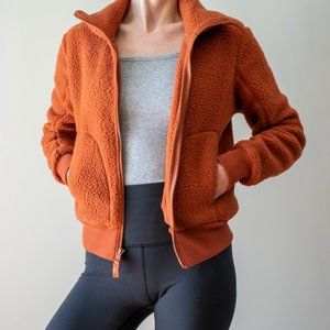 Zip-up bomber style teddy jacket from Everlane in the colour "Dark Spice." Purchased last fall and only worn once. Cozy jacket with pockets, cuffs and a high neck you can zip up when it starts to get chilly. Beautiful colour for the fall season! No longer available on Everlane's website. Excellent condition. Size XXS.