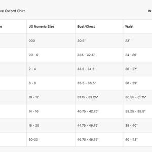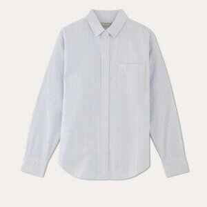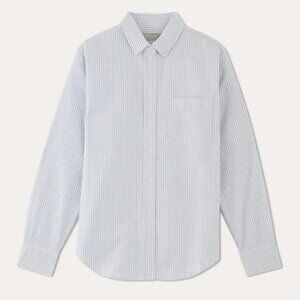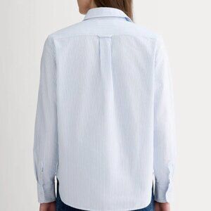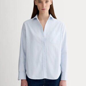 Borrowed from the boys—but better. We took the same fabric we use for our men’s oxfords and made a modern, relaxed version just for you. Tucked in or out, unbuttoned or buttoned—it’s an everyday classic.Relaxed fit, 100% organic cotton. Size 4. Please see sizing chart in pictures. From a pet and smoke free home. In excellent condition. Just wrinkled from storage. Colour is a brighter blue like the photos.
