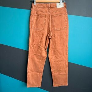 These Everlane jeans feature a chic tan color. The straight-leg silhouette offers a tailored fit, making them a versatile addition to any wardrobe. Crafted from sturdy denim, they provide a clean and contemporary look.
