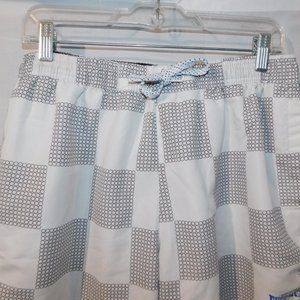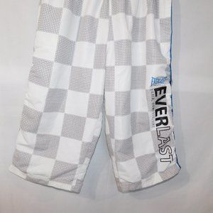 This pair of Mens Large EVERLAST White Gray check Capri Length mesh lined Activewear Swim Shorts are Great clean condition. Shorts are 100% Polyester - Machine washable. - hang dry. Features waist draw cord, each side has mesh lined slit pocket. Can be worn for activewear boxing ect or used a swim shorts.