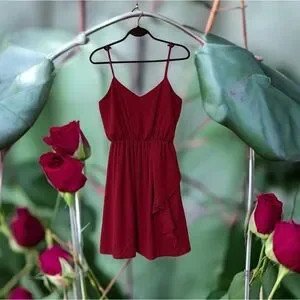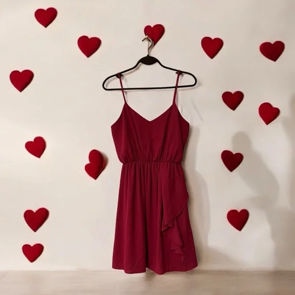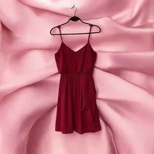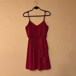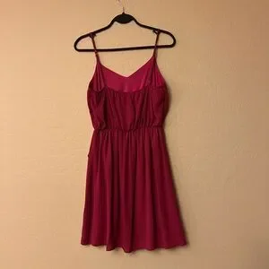 π Everly Raspberry Pink Short Slip Dress. Ladies size Medium. V bodice front. Adjustable spaghetti straps. Elastic at top edge of bodice back. Elastic waist. Flowy skirt with ruffle draping down one side. Lightweight. Lined. 100% Polyesterπ