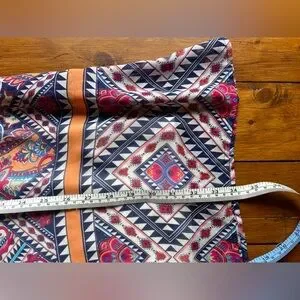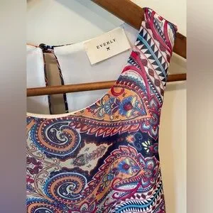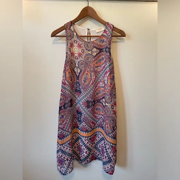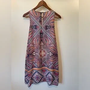 Easy to wear shift dress from Everly. Bohemian vibe pattern with geometric and paisley designs throughout. Worn, as pictured with my reluctant son years ago to my nephew's wedding. Taken out a handful of times over the years. Well cared for.