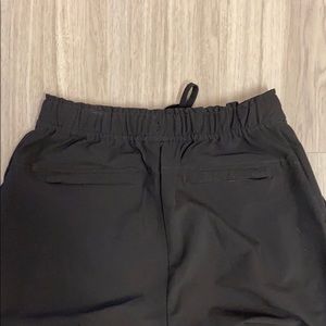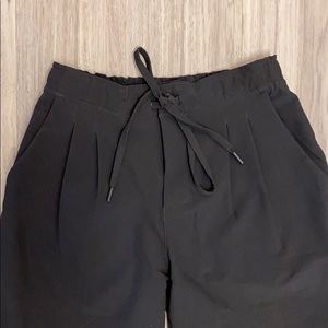 Black MPG pant. Elastic waist band with draw strings has a single button and zips at the front. Has two zippered pockets at the back and two regular pockets at the front. Cuffed hem. Can be dressed up or down. Made of wrinkle-free fabric.
