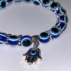 These handcrafted bracelet features striking blue Evil Eye beads with silver accents and a protective Hamsa Hand charm. Together, they form a powerful symbol of protection and good fortune.