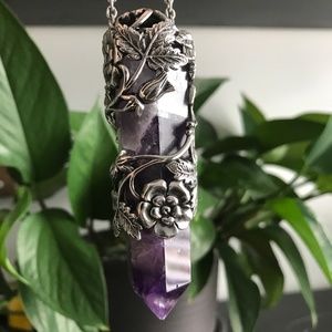 "Metal flowers and vines wrapping around an amethyst wand point. All necklaces are 3 1/2″ to 3 3/4″ of an inch long and 3/4″ to 1″ inch wide. They vary because each is one of a kind; however, the floral design is the same... Floral Design and chain are hypoallergenic stainless steel. Will never tarnish or fade. The metal will always have a darker look."