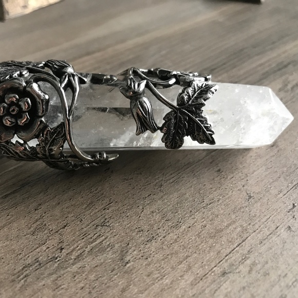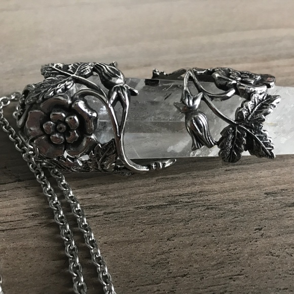"Metal flowers and vines wrapping around a wand quartz crystal point. All necklaces are 3 1/2″ to 3 3/4″ of an inch long and 3/4″ to 1″ inch wide. They vary because each is one of a kind; however, the floral design is the same. **26″ inch chain is included. This is edition 3 of this necklace. Floral Design and chain are hypoallergenic stainless steel. Will never tarnish or fade. The metal will always have a darker look."