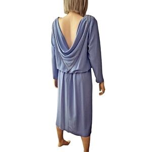 Features: Blouson bodice, Rounded front neckline, Deep draped cowl back with hand stitched beading, Midi length, Draped front skirt, bracelet length vented sleeve, Union made vintage 80s, invisible back zipper with hook and embroidered eye close, YKK zipper, Unlined, Non stretch fabric, *Rare find*