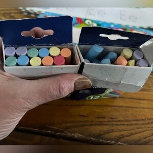 Many excellent teaching tools! Carson Dellosa yellow nylon counting pouch. You can use bundled popsicle sticks, tens blocks or other (comes with 1 hundred block). 22 owl laminated name tags for desks, lockers or to practice writing names and 26 laminated upper/lowercase letter tags-great for a primary centre (use hand sanitizer to wipe clean and wipe-off markers). Handmade vowel centre with bean bag type “look & find” windows. 2 packs of coloured chalk, 3 light up classroom management buttons- magnets on back to attach to chalkboard or magnetic object (door etc). Each needs 3 AA batteries (not included- but heavy-duty magnets are). Handmade reading booklets to help kids remember when stuck.