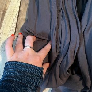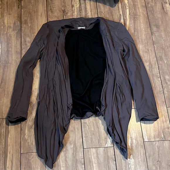 Has fake pockets in either side. Styled to look like a blazer but feels and wears more like a sweater