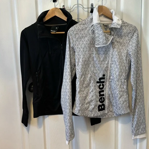 2 bench sweaters both size small. Asymmetrical zippers. White/black geometric pattern and black