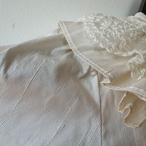 100% ivory silk, gathered skirt, exquisite lace trim throughout, 3 button closure at back, underslip and net crinoline are attached, gathered cuffs with lace trim.