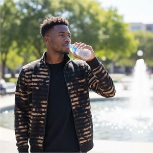 Stylish zip-up hoodie with striped pattern. Perfect for casual wear.