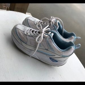 White and light blue ExerSteps rocker bottom toning walking sneakers in size 8. Have wear and discoloration throughout consistent with use.