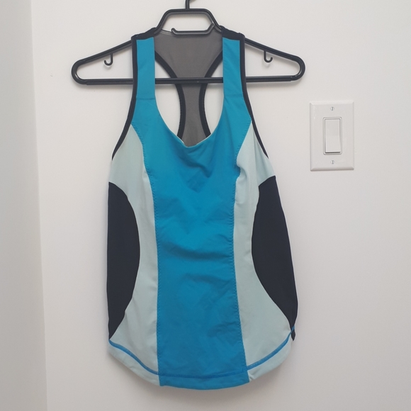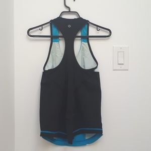 Blue and black Lululemon exercise top.