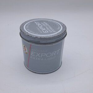 An empty can of Export Extra Light Tobacco from the 1990s (I believe, as that was when these cans were most popular). The tin is silver with white lines along with a single red line. It has wear, especially on the lid which also has a ding. It once held 200 grams of tobacco and is bilingual with writing in both French and English. The tin is 4 3/8" wide by 4 1/8" tall.