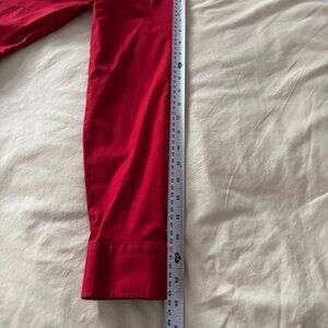 Extra-slim fit dress shirt from Express in a rich, vibrant red. French front (i.e. no placket) and no breast pocket for a clean silhouette, and two darts in the back for slimming.