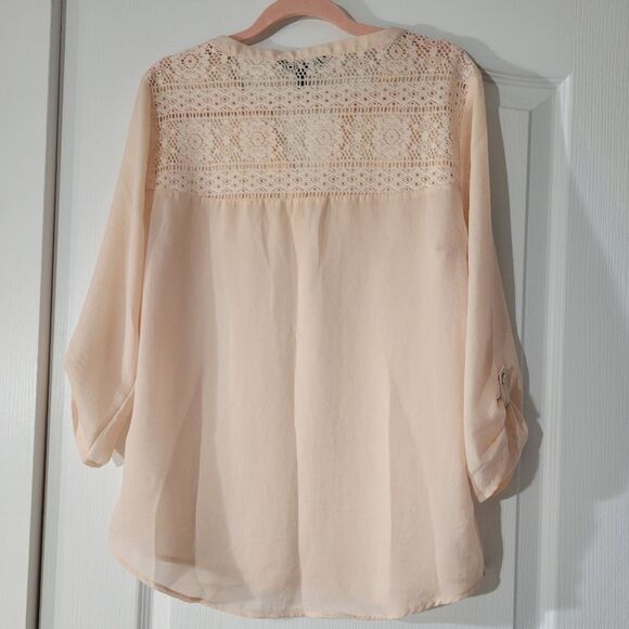 Beautiful light weight blouse with lace detail at shoulder. Shell buttons. Pale pink.