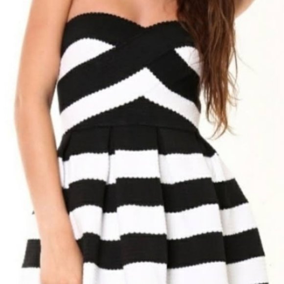 Express, NWOT, Size M, but see flatlay measurements. Black and White horizontal stripe structured strapless dress with silicone adhesive (cleavage tape) to prevent shifting. Has some stretch. One tiny snag on the back, but not visible, per pic. Great for any special occasion!! Beautiful dress!!