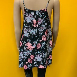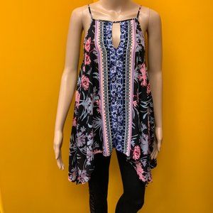 Long Black Tank with Floral Pattern. Handkerchief Hem. Keyhole Opening at Neckline. Spaghetti Straps