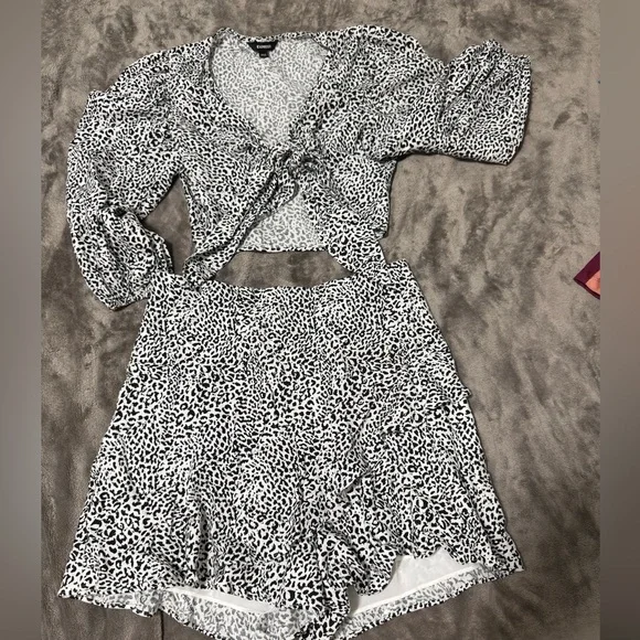 Chic animal print set with a stylish top and matching bottoms. Ideal for a trendy outfit.