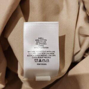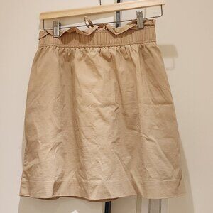 Hits above knee and has pockets. Stretchy skirt with tie band, pockets and lining.