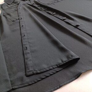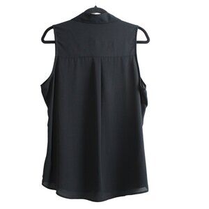 A button-down shirt in classic black shade. The material has no stretch but is lightweight and flowy. The sleeveless style with the pleated back creates a breezy, easy-to-move-in feel. Looks great on its own for a casual look but also dresses up nicely when layered under a blazer. New with tags. Excellent condition.