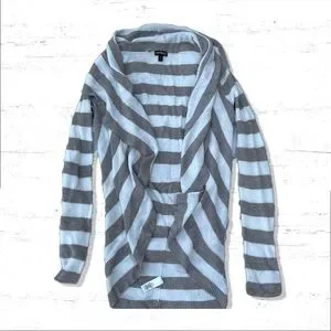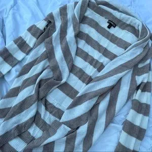 Soft knitted cardigan that has cream and light brown/cream stripes throughout. Super cute light sweater for summer evenings or whatever! Has the “waterfall” look.