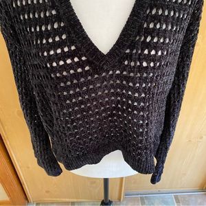 Cozy chenille open knit sweater in black. V neck and a cropped for