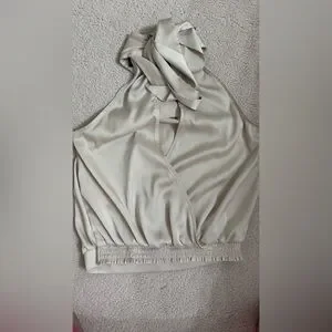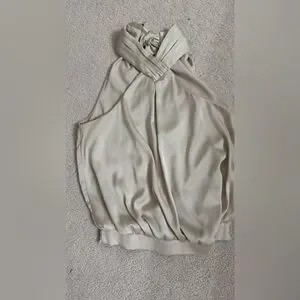 This elegant cream blouse from Express features stylish ruffled details and chic cut-out accents, perfect for adding a touch of sophistication to any outfit.