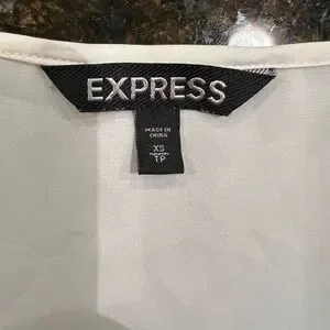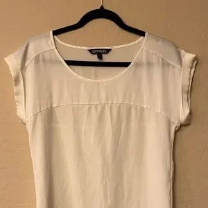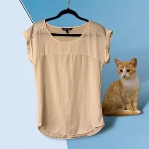 💕Express Cream s/s Top. Ladies size XS. Seams at front & back yoke & at shoulder front. Rolled sleeve cuffs. Rounded hemline. Lightweight. No fabric tags (Polyester blend?) Feels like Silk💕