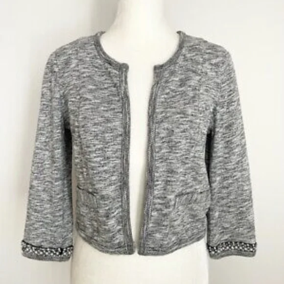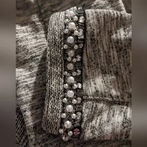 Light grey Express cropped cardigan with pearl embellishments on the cuff.