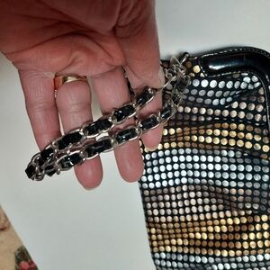 Express Design Studio Gold, Silver and Bronze Dotted Material Wristlet Bag. Removable black vinyl wrapped in gold chain strap. Zippered closure. Bag is in excellent condition. Great for an evening out or as a cosmetic bag. Approx 11" x 6".