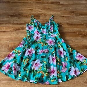 Flowy Turquoise mini dress with tropical floral pattern