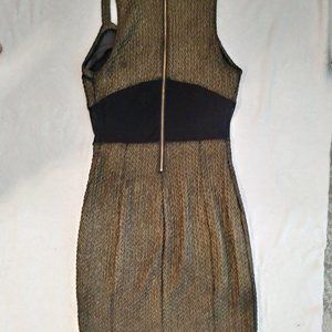 Shimmery gold textured material. Sheer black mesh cutouts at top, sides, and back. Above the knee length. Worn once. No signs of wear. Size 8.