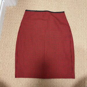 Classic and bold, this red and black houndstooth pencil skirt from Express brings a touch of corpcore edge to any wardrobe. Designed in a flattering straight silhouette with just the right amount of stretch, it’s perfect for both office wear and elevated casual looks. Features a hidden back zipper for a smooth fit and faux leather trim along the waistband.