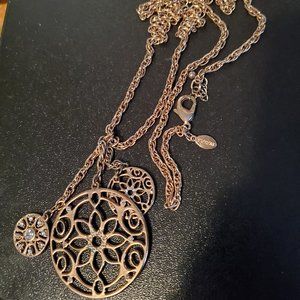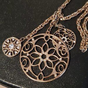 Express Long Gold Tone Chain Circle Pendants Necklace Open Works Rhinestone 36"