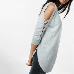 Express Marled Gray Lace-Up Cold-Shoulder Bateau-Neck Circle Hem Sweater XS-XXS