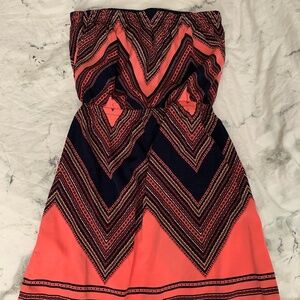 Brand new, never worn without tags! Beautiful strapless Express mini dress in a vibrant pink and navy blue chevron pattern. It has a faux wrap effect skirt and elastic shirring on the waist and top. Made of 100 % polyester in a super breathable fabric perfect for summer!