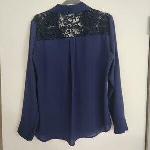 Chic and versatile, this Express Portofino shirt features a navy chiffon body with elegant floral lace panels across the shoulders and upper back. Slim fit silhouette, button front, roll-tab sleeves, and dual chest pockets make it perfect for both work and evening wear.