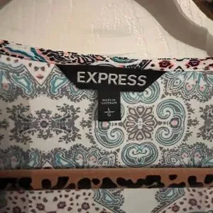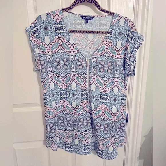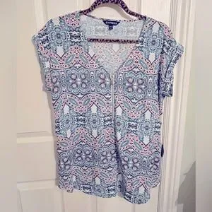 Zip front. Blue and pink are more neon in person. Cuffed sleeves. Longer in back.