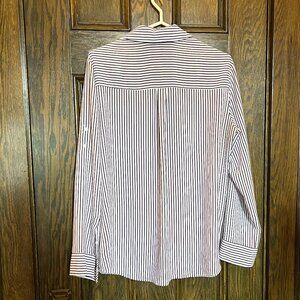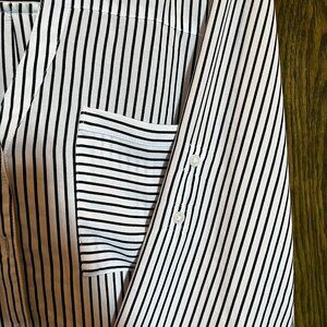 Express Portofino Button Down Dress Shirt - Black and White Stripe (Large). Worn with some discolouration that could be remedied with more washing. Slim fit. Buttons and internal tab for rolling up sleeves.