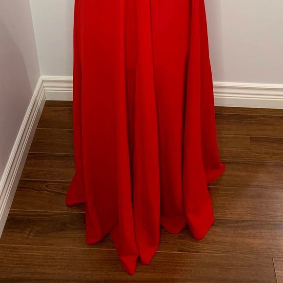 Beautiful red dress with unique neck line. Lace up front can be pulled to the side to make strapless dress or tied behind neck for a halter look. Perfect gown for grad, wedding, and formal events! Never worn.