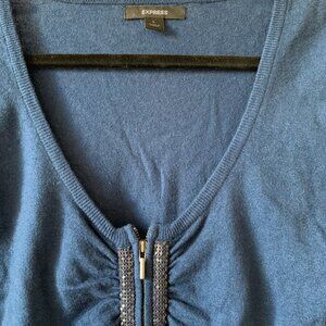 This navy blue cropped cardigan from Express is the perfect blend of cozy and edgy! Featuring a bold zip closure with shiny metallic details, this long-sleeve knit adds a stylish twist to any outfit. Dress it up for a night out or layer it over a cami for a more casual look!