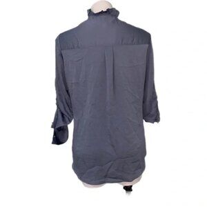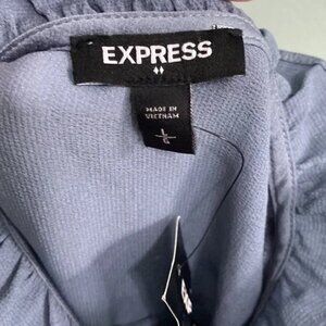 Elevate your wardrobe with this stunning Express blouse, new with tags! Crafted from a silky polyester satin in blue gray color this long-sleeved button-down features a romantic high ruffled collar and roll-tab sleeves for versatile styling. The relaxed fit and curved hemline make it perfect for both work and weekend wear.