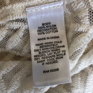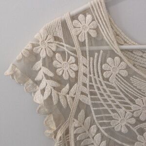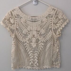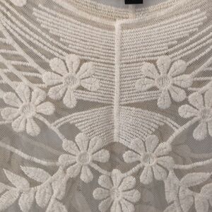 Express pull on sheer top with cap sleeve. Ivory colour mesh like fabric with floral embroidery on same colour. Pit to pit 17”. Length from shoulder to hem 29”