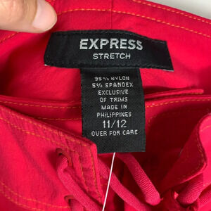 Express Stretch Y2K Shorts in a vibrant red pink hue, perfect for beach days or casual outings. These lace-up shorts feature a tie front, pockets, and a comfortable athletic fit in size 11/12. Made from a blend of nylon and spandex, the fabric stretches for a flattering look. Embrace a surf and Barbiecore theme with these feminine and beachy shorts from Express, ideal for juniors looking for a trendy addition to their wardrobe.